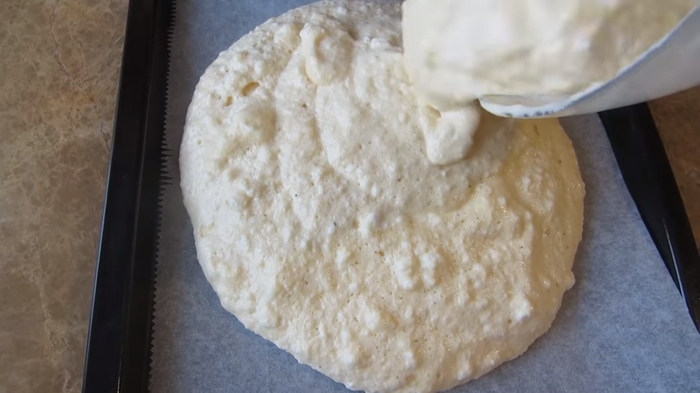 Распределить тесто по форме (у меня диаметр формы 26 см), сделав бортик.