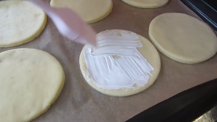 5. Тесто разделить на 2 части, выложить тесто на противень, выстеленный пергаментом или силиконовым ковриком, разровнять по всей площади лопаткой.