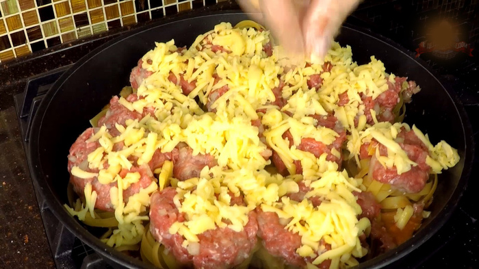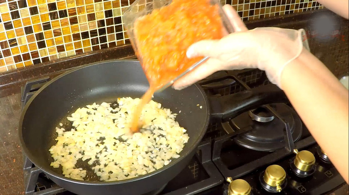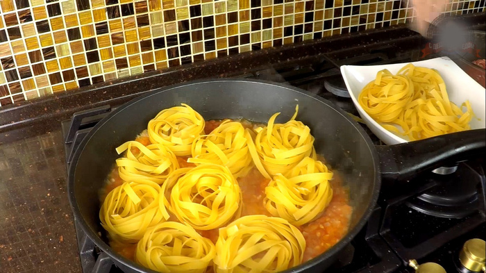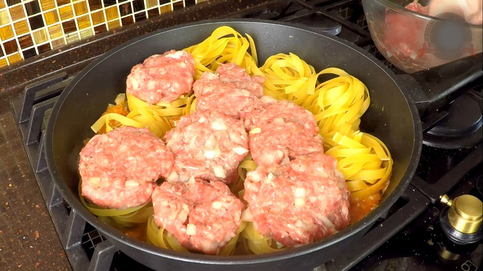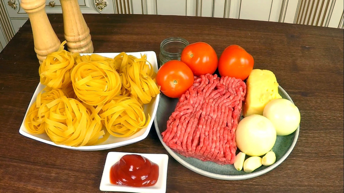 Подготовить все ингредиенты. Натереть помидоры на крупной терке. Кожура от томатов нам не потребуется. Очищенный чеснок придавить ножом. Так его легче потом резать. Мелко порубить. Лук почистить и нарезать мелкими кубиками. Половину добавить в фарш, посолить, поперчить и хорошо перемешать. Фарш можно взять любой на ваш вкус. У меня покупной из говядины. Натереть сыр твердых сортов на крупной терке. В разогретую сковородку залить растительное масло. Остальной нарезанный лук выложить в сковородку. Обжарить до румяного цвета, буквально пару минут. Добавить помидоры и мелко нарезанный чеснок. Жарить 5 минут постоянно помешивая. Добавить томатную пасту или томатный кетчуп, посолить, поперчить и перемешать. Выложить гнезда в сковородку. Заполнить верхушки примерно 1 ст.л. фарша. Сверху на гнезда с фаршем высыпать натертый сыр. Залить кипятком так, чтобы соус закрывал гнезда почти до самого верха. Дать закипеть и перевести на слабый огонь. Готовить 20-25 минут под крышкой.