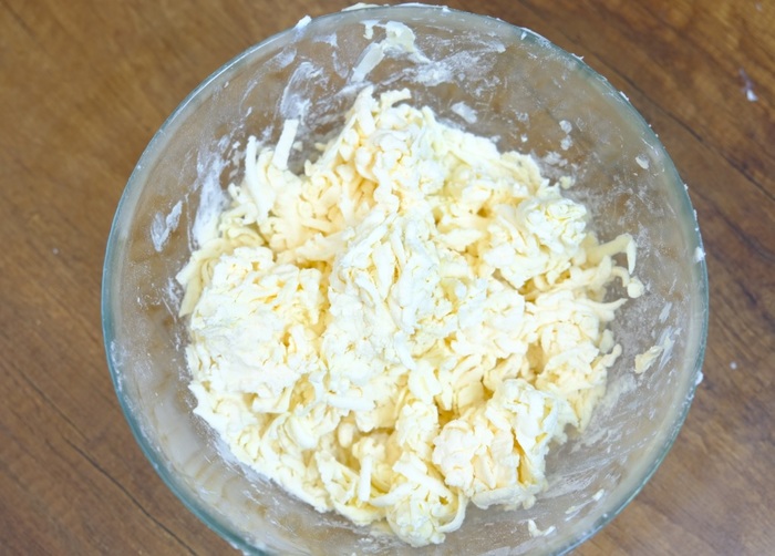 1. Маргарин (или сливочное масло) и плавленые сырки поместить в морозильную камеру на 1 час, чтобы лучше натирались. Натереть на крупной терке, окуная в просеянную муку, чтобы не так прилипали к терке.