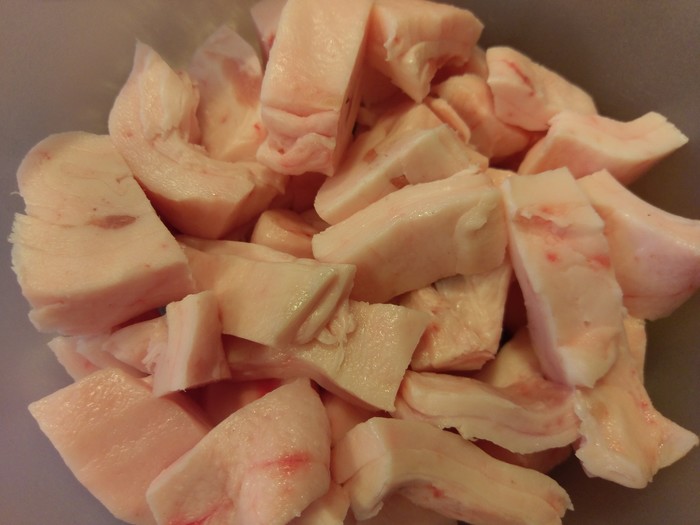 Ну что ж, пока приступать к печени. Порежем её на произвольные куски размером, не больше спичечного коробка. А дальше будем варить минут 20 (если куриная, то минут 10, если говяжья, то зачем она тут?). Осторожно при варке, печень, как и лёгкое или вымя, при варке пытается свалить в закат. Так что лейте больше воды и следите за огнём. Солить при варке не надо.