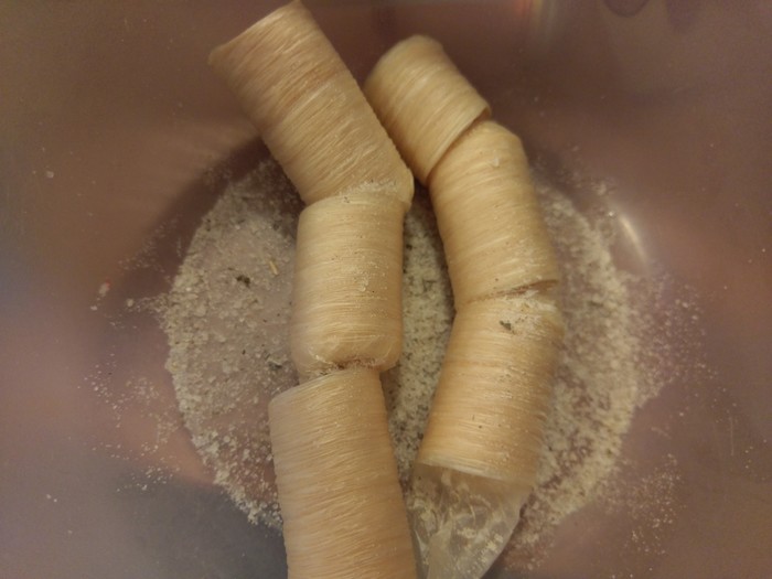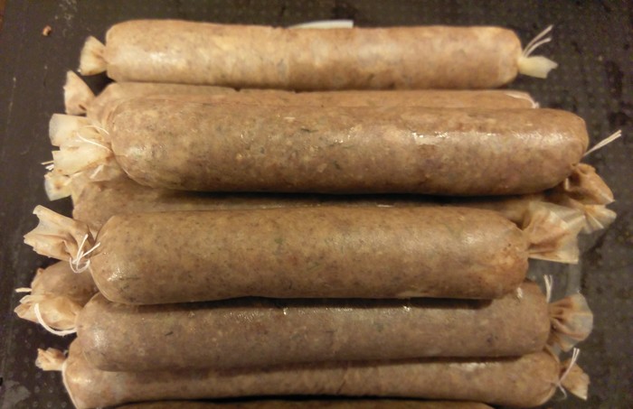 Я просто немного нюансов добавлю. Завязали кончик - проколите у основания зубочисткой и снова натяните, так у вас будет плотнее набивка. Да и после того, как колбаска полностью набита и завязана, нужно поколоть её по всей длине, физика - жестокая штука.