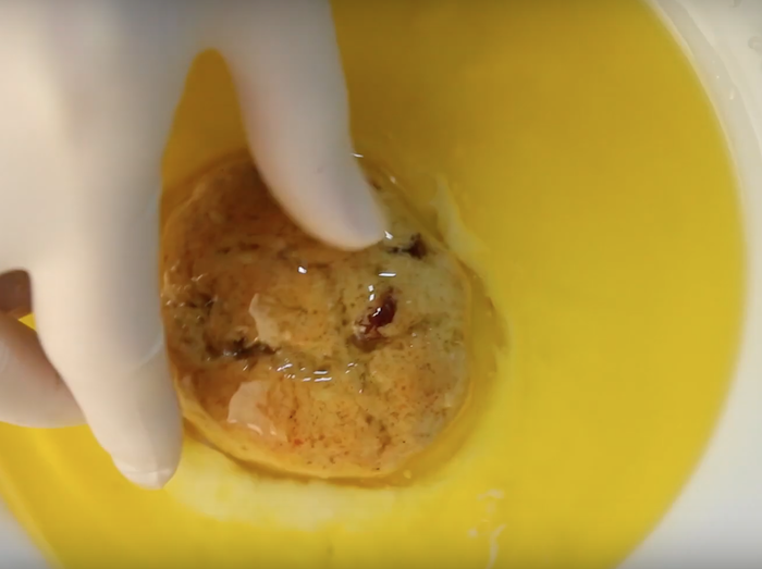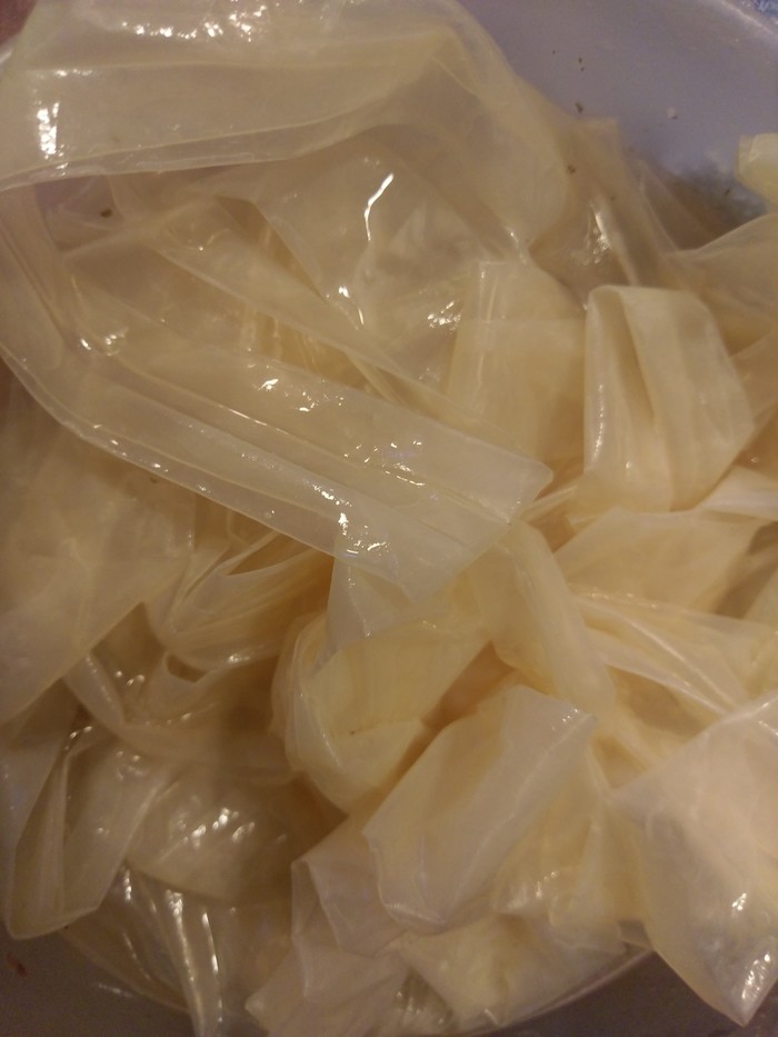 Ну вот печень уже сварилась, пора бы её отделить от воды и поставить немного остыть. А пока замочим в воде с солью коллагеновую оболочку. Так она выглядит до: