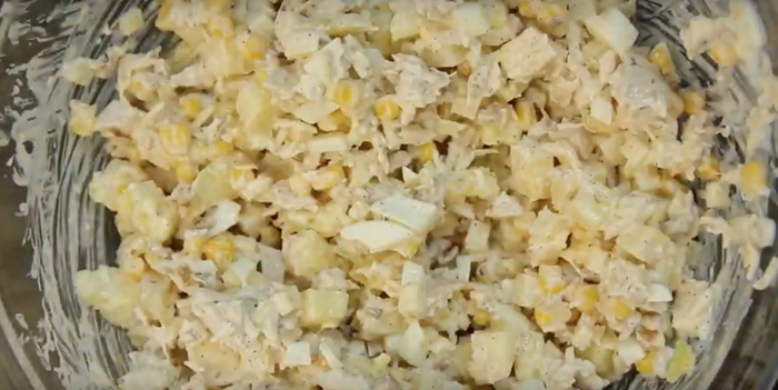 Туда же добавляем консервированную кукурузу. Все это дело перчим и солим по вкусу, добавляем наш любимый и сильно "полезный" мазик и перемешиваем.