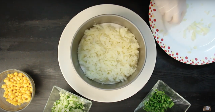 Первым слоем на сервировочное блюдо выкладываем картофель, разравниваем и делаем сеточку из майонеза.