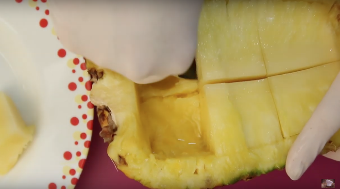 Разрезаем ананас на две части. Внутреннюю часть(мякоть) вырезаем и нарезаем на маленькие кусочки, а саму кожуру откладываем, ее мы использую как посудину для декора.