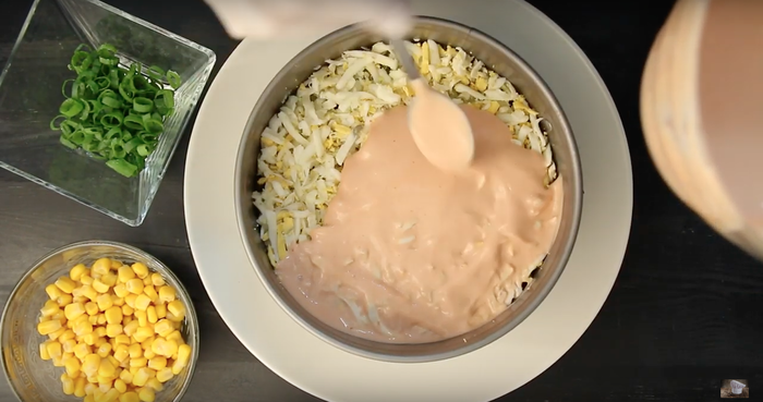 Завершаем салат слоем майонеза.