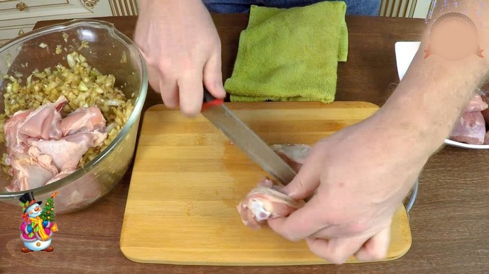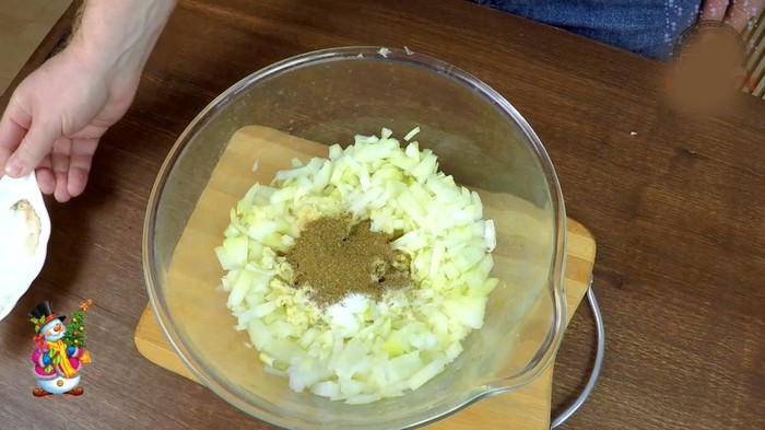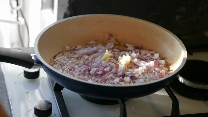Наливаем сколько-то масла на сковороду - столько чтоб нормально жарить лук, плюс ещё немного. Включаем огонь под сковородой. Крошим лук кубиками и кидаем в масло когда разогреется.