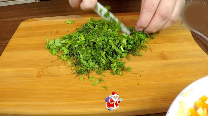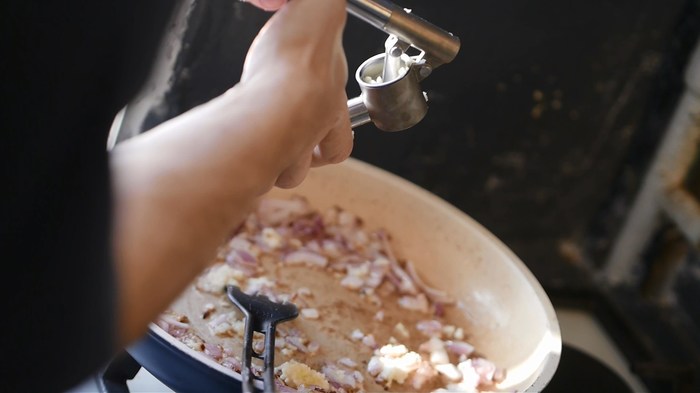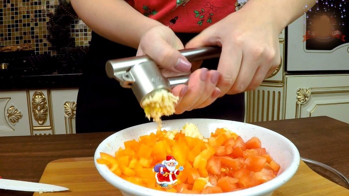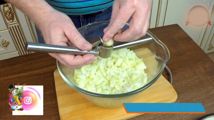 Затем пока лук разогревается, решаем, что делать с чесноком. Я его давлю и кидаю к луку - пусть немного попассеруется. Вы можете поступить так же, а можете покидать дольки чеснока целиком - тогда их надо в полтора раза больше. Можете так же не жарить чеснок, а положить раздавленный чеснок из чеснокодавки уже в остывающую заправку. Тогда его надо вдвое меньше.