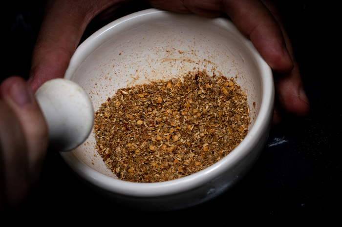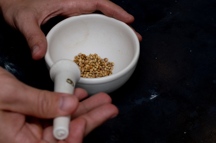 Пока лук с чесноком подрумяниваются, растолчём наш кориандр в ступке.