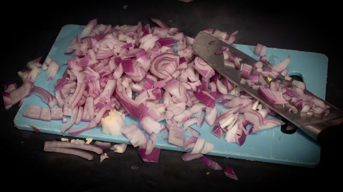 Лук репчатый - здесь я кладу салатный красный лук для цвета. Если цвет не принципиален. а жаба вдруг проснулась - берите самый дешёвый и злобный репчатый лук. Здесь он ничем не хуже, потому что после жарки его злоба утихнет. По две луковицы (130г каждая) на полкило сухой фучжу.