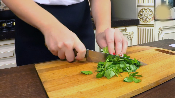 Параллельно нарезаем соленые огурцы и по готовности закидываем и их в казан. К этому времени, как раз, поджарится в отдельной сковороде картофель, мы ведь про него не забыли. Нам остается только добавить и его в казан да и не забыть про зелень – петрушку и кинзу, совсем немного, но предварительно их порубить конечно. Аккуратно всё перемешиваем и оставляем потомиться под крышкой на самом малом огне минут 10 примерно.