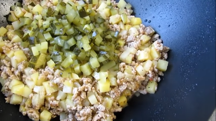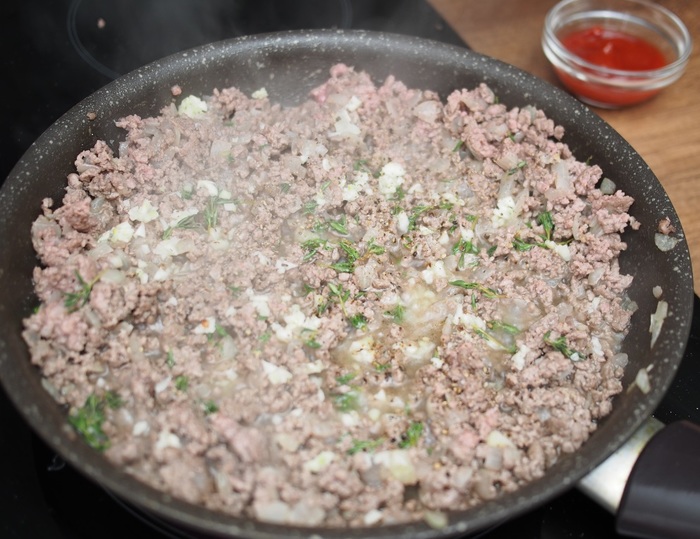 Приготовлю начинку. На сухой сковороде обжариваю мясной фарш до готовности, постоянно его перемешивая и разбивая комочки. Затем его солю, перчу и добавляю к нему мелко порезанный чеснок, все перемешиваю и обжариваю еще примерно минуту. Убираю сковороду с плиты и перекладываю готовый фарш в миску, чтобы он быстрее остыл.