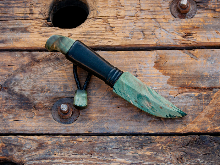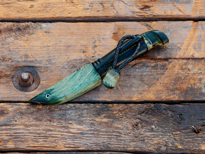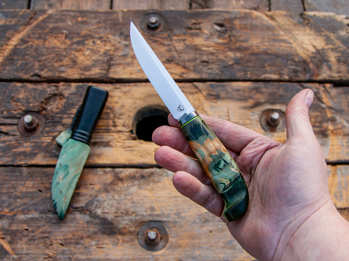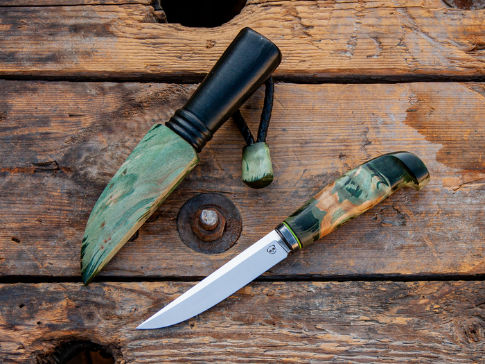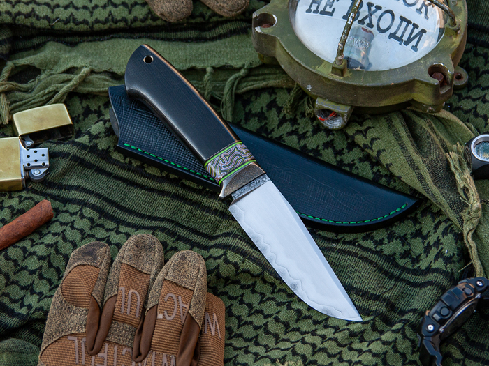 Больстер из нейзильбера, зеленая проставка из G10 и стабилизированный сувель березы.