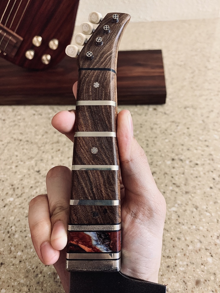 Люди мы не гордые, поэтому сделали все скромно, но со вкусом. Колки (белые хреновины на грифе гитары) сделаны из бивня моржа (никакого браконьерства), рукоять из стабилизированного ясеня, красная проставка - стабилизированный зуб мамонта, а в качестве больстера и остальных металлических частей - мельхиор. Крепил на мозаичные пины.