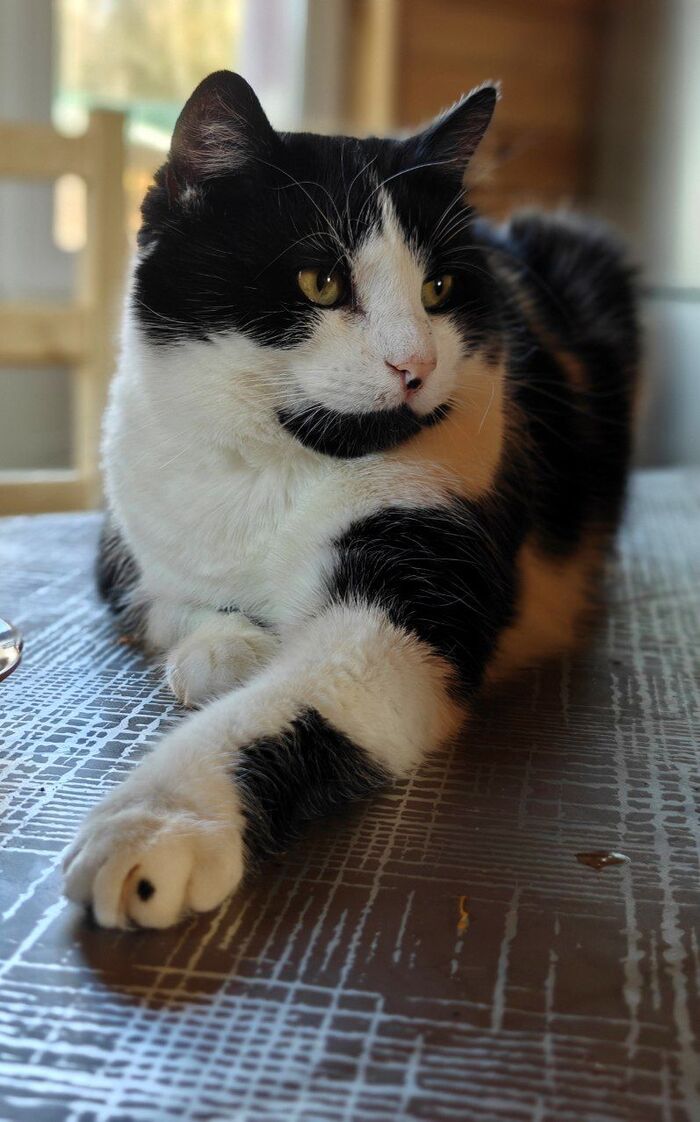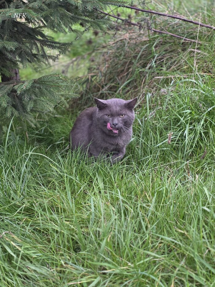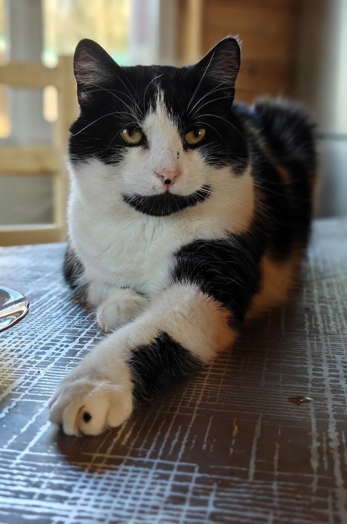 Этот усатый гурман явно только что закончил трапезу — но его выразительное облизывание и суровый взгляд говорят об обратном! Кажется, он оценивающе смотрит на нас и прикидывает, кто станет достойным десертом. Может, это намёк, что пора доставать угощение?