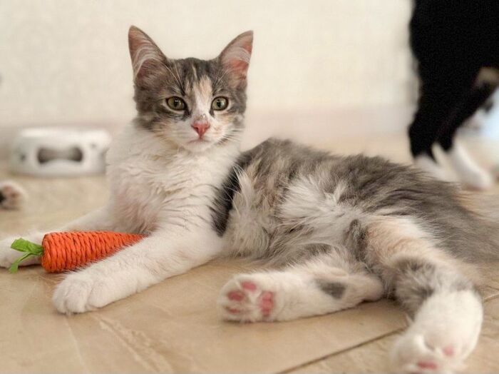 Гриша был спасен с улицы, сейчас живет на передержке в компании других котят-спасенышей.