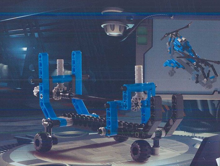 Эти здоровенные колеса конечно интересно смотрятся, но в целом сборка совершенно примитивная. Но при этом момент с мотора передается через какой-никакой редуктор, мотоцикл едет вперед и не падает, за счет клыков из бионикла довольно стильно выглядит, хотя по сути функция у него всего одна, ехать вперед. Изначально к нему еще должна прилагаться картонная рампа, но она явно погибла у прошлого владельца этого набора. Единственный вопрос, который у меня возник, это почему белый лифтарм на три ставится по инструкции принтом вниз. В обоих наборах есть эти детали с принтом 40 лет техник, но в вертушке надпись читается, а тут почему-то спрятана.