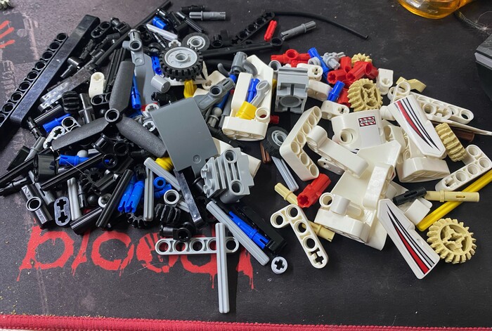 До последнего гадал, для чего тут шестеренка из КПП будет использована. В принципе оказалось предсказуемо. Конечно набор собирается вокруг мотора, с таким количеством деталей от него совершенно не стоит ожидать каких-то гениальных техник.