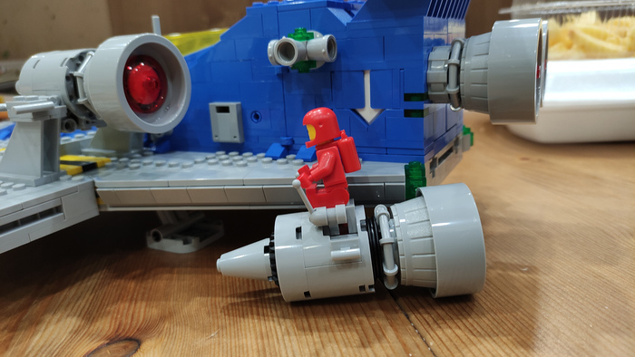 На девятом шаге собираем двигатели. Два устанавливаем сзади корабля. Два на крыльях. Двигатели с крыльев можно снять и использовать как средства индивидуального передвижения.