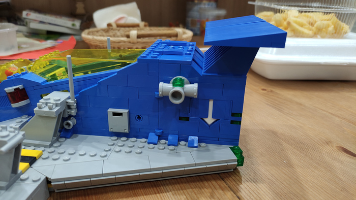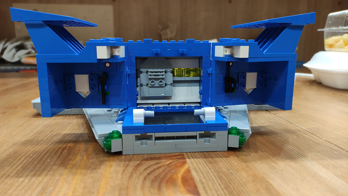 Шестой шаг. Завершаем сборку крыльев и устанавливаем в задней части пандус. В задней части устанавливаем два ящика, которые открываются снаружи корабля. В одном запасной балон с кислородом, в другом два фонаря.