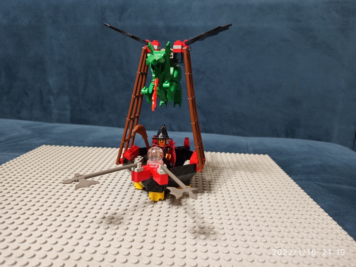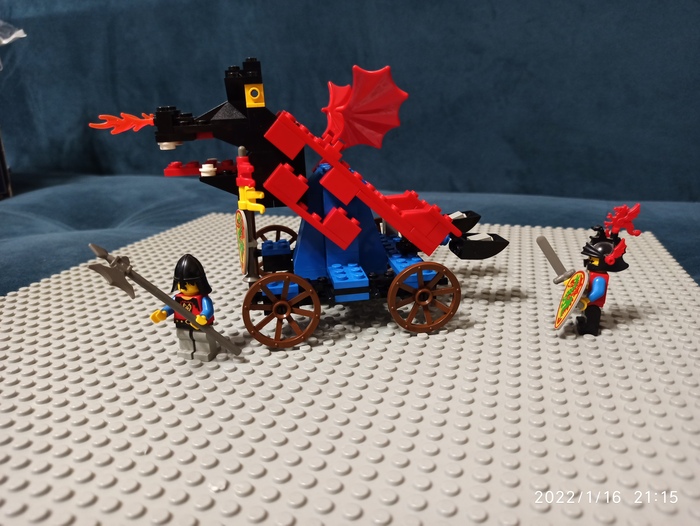 Dragon Defender набор 6043. Катапульта с головой дракона, она метает кубики, не сказать, что прям далеко, еще и приловчиться надо, но в игровом процессе очень увлекательно швырять кубики по минифигуркам. Еще из данной линейки у меня был набор Dragon Wagon набор 6056. Поскольку замков Рыцарей Дракона у меня не было, то они у меня всегда нападали на замки и драконья повозка была как супер оружие у данных рыцарей.