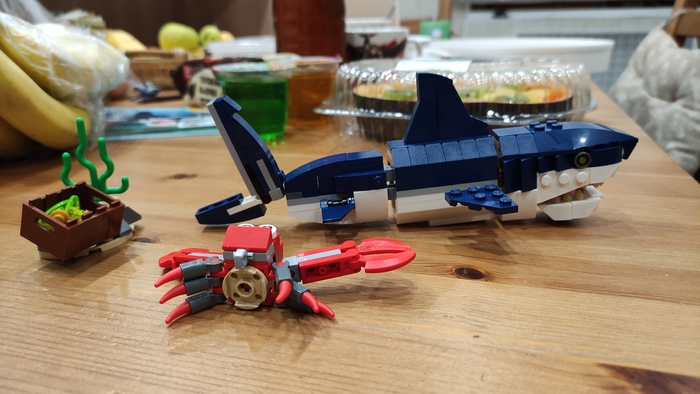Вместе с акулой собираем краба и сундук с сокровищами. Из интересного, что у акулы внутри красные и розовые детали, вроде как собираешь сначала её внутренности, а потом шкуру.