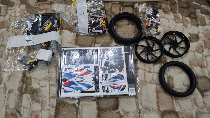 После вскрытия слегка помятой коробки нас встречают 11 этапов пронумерованных пакетиков, пакет с покрышками и инструкция с наклейками.