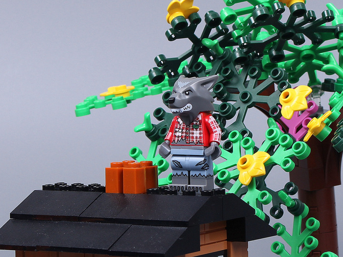 Тогда волк залез на дерево, а с дерева перебрался на крышу кирпичного домика.