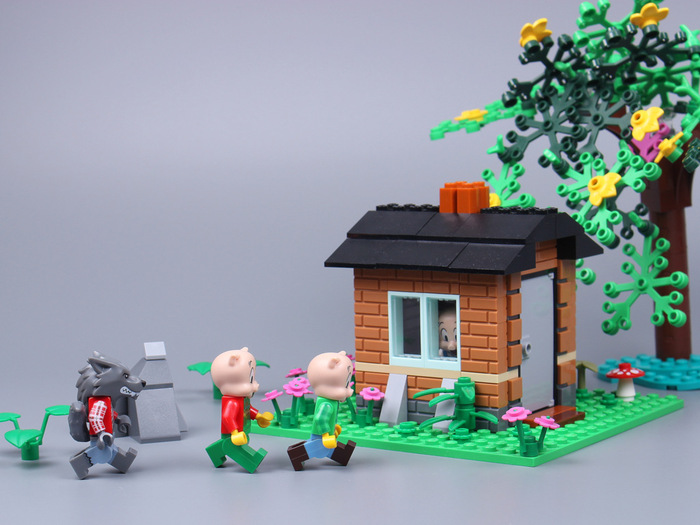 Поросята выскочили из полуразрушенного домика из соломы и побежали к домику из веток.