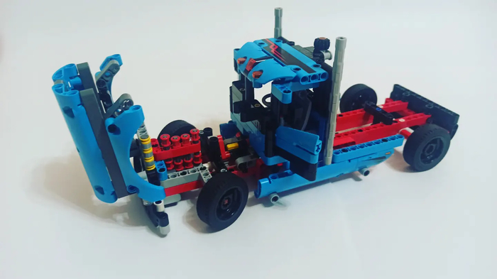 Синий грузовик создавался по остаточному принципу, после работы над тягачем и прицепом у меня осталось много деталей и я решил попробовать сделать ещё что-то. Главной проблемой была нехватка обычных пинов на 2 и 3, пришлось импровизировать.