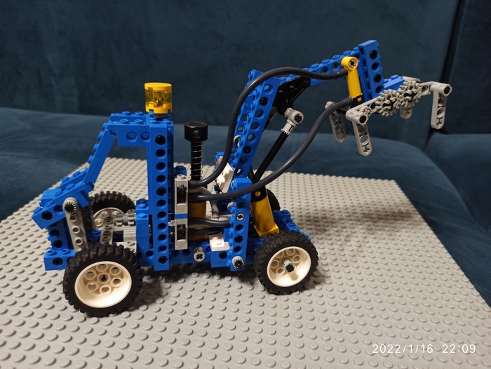 Данный набор 8042 Universal Pneumatic Set 1993 года, так же как и предыдущий - это стартовый набор с пневматикой. В наборе 4 модели: машина с открывающейся кабиной (честно сказать не помню уже, что она делает, надо будет собрать посмотреть), складской погрузчик у которого опускается/поднимается механизм для поднятия паллет, машина с поднимающейся тележкой для ремонтной бригады (я не знаю как правильно назвать) и данный трактор с клешнями, для захвата всякого хлам. У всех моделей поворачиваются колеса с помощью мигалки на крыше.
