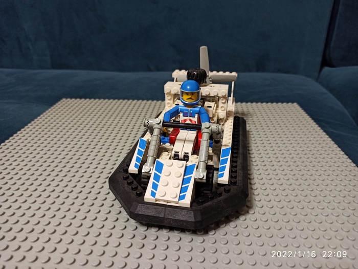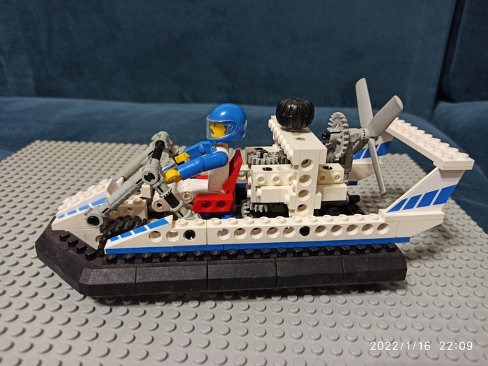 Набор 8824 Hovercraft 1994 год и техник человек из набора 8714 The Lego Technic Team 1993 года (вся команда есть, просто не сфоткал). Модель простая, поворачиваются колеса с помощью черного колеса сверху, так же при езде крутится винт. Прикольно сделан борт, он резиновый, под ним специальные детали на которые надевается резина, спереди и сзади наклейки. Альтернативная модель вертолет, функционал не помню уже, но скорее всего крутятся оба винта.