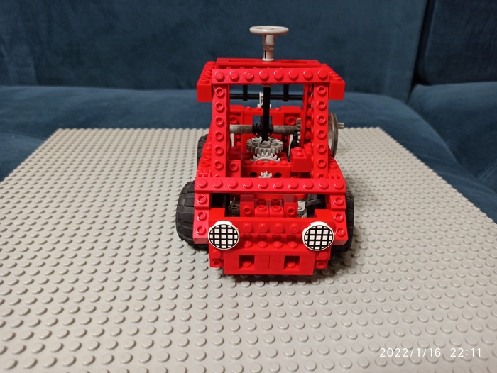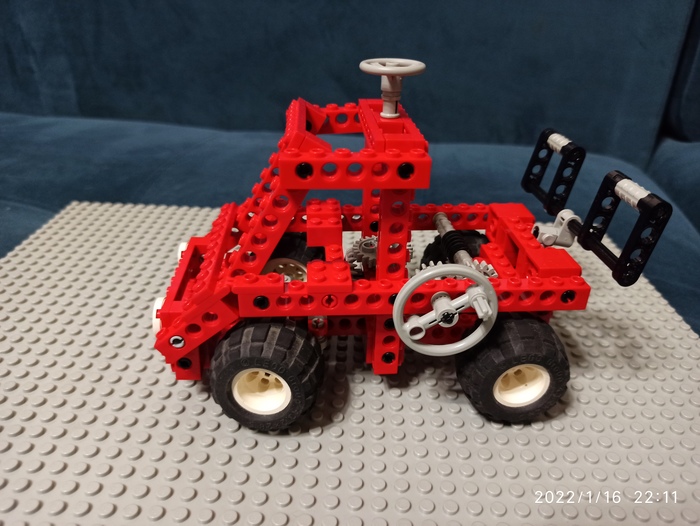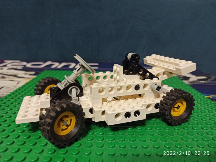 Стартовый набор 8022 Technic Starter Set 1993 год. Дальше я уже не помню когда и при каких обстоятельствах мне дарили наборы, просто опишу их. Собрал буквально вчера, так как было утеряно 6 деталей, докупил, но все равно при сборке выяснилось, что не хватает оси на 2, пришлось заменить пока ось на 3. На фото видно, как над рулем сзади торчит ось по бокам. В данном наборе 4 модели: самолет, робот, эвакуатор и гоночная машина. Модели все очень простые, у самолета крутится винт, если его катать, у робота шевелятся руки когда он едет, у эвакуатора чуть сложнее, поворачиваются колеса с помощью мигалки на крыше кабины и опускается и поднимается сзади крюк, ну и у гоночной машины крутятся колеса с помощью руля. Решил собрать гоночную машину в пару к машине выше. Здесь за счет больших по диаметру колес машине имеет более высокий клиренс и катать ее более приятно, чем предыдущую, так же модель более крепкая по сборке.