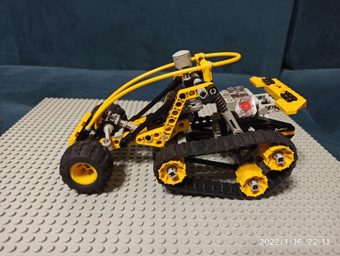 Набор 8414 Mountain Rambler 1997 год. Только сейчас заметил, что передняя деталь прикреплена вверх ногами и боковые наклейки так же наклеены вверх ногами. Прикольный вездеход, колеса поворачиваются с помощью крутилки сверху, двухцилиндровый двигатель, цилиндры двигаются при езде, имеет уже заднюю подвеску, до этого ни у одной модели которые у меня есть нет подвески, даже у флагманского грузовика 1997 года ее нет, есть имитация подвески на задние колеса, но по факту ее нет. Минус один, гусеницы не так хорошо крутятся, приходится прижимать вездеход к полу, чтоб они начали крутиться. Почему нет руля? Альтернативная модель - робот, у которого при езде поворачивается голова влево/вправо и руки опускаются/поднимаются, так же есть клешни которые защелкиваются с помощью пружин.