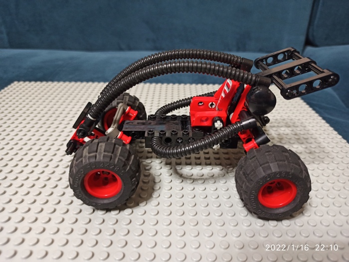 Набор 8226 Mud Masher 1998 год. Прикольный багги, в него можно усадить человечка техник, но у меня один вопрос, где руль? Детали без принтов, все наклейки. особенностью этой модели является то, что поворот колес осуществляется наклоном влево/вправо самой модели. Сзади (не сфоткал) крепятся резинки, которые дают сопротивление и отдачу при наклоне, возвращая колеса в положение прямо. Идея прикольная, но по сути в ней (в модели) больше ничего интересного нет. Альтернативная модель трехколесный мотоцикл, с таким же механизмом поворота и опять без руля. Резинки естественно растянулись и высохли со временем. Благо были запасные. Как оказалось, у меня были пару наборов с запасными деталями.