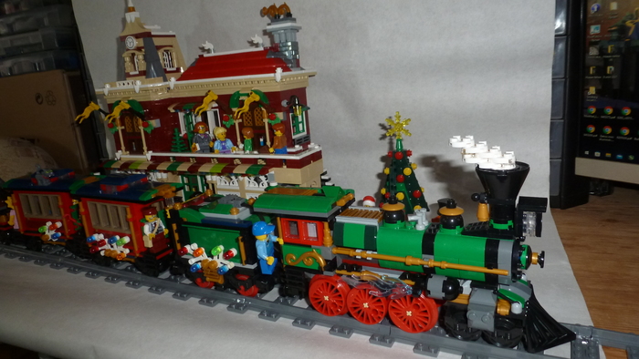 До Новогодних праздников еще месяц, но я уже приготовил Праздничный поезд и Зимнюю праздничную станцию. Построено на основе набора 10263-1 - Пожарная часть Зимней деревни и двух наборов 10254-1 - Поезд зимних праздников. Специально деталей не докупал, собирал и додумывал конструкцию в расчете того, что в загашниках было. Привод и аккумулятор поезда в тендере, прожектор на светодиоде от ленты светодиодной, через балластный резистор, провода МГТФ самые тонкие какие нашел дома, пришлось правда нескольких местах детали просверлить миллиметровых сверлом , что бы провести провода до прожектора. Надо бы конечно еще в вагончики провести освещение, да и на саму станцию подсветку сделать.