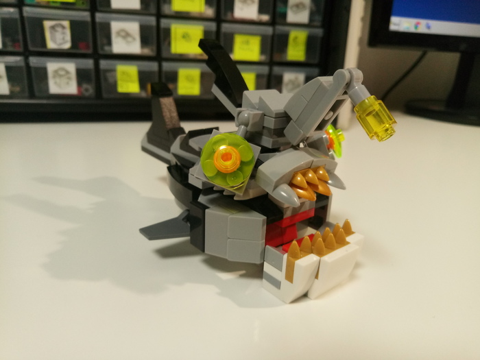 В процессе сборки. Виден привод от колеса к нижней челюсти. Сама колесница весьма объёмная.