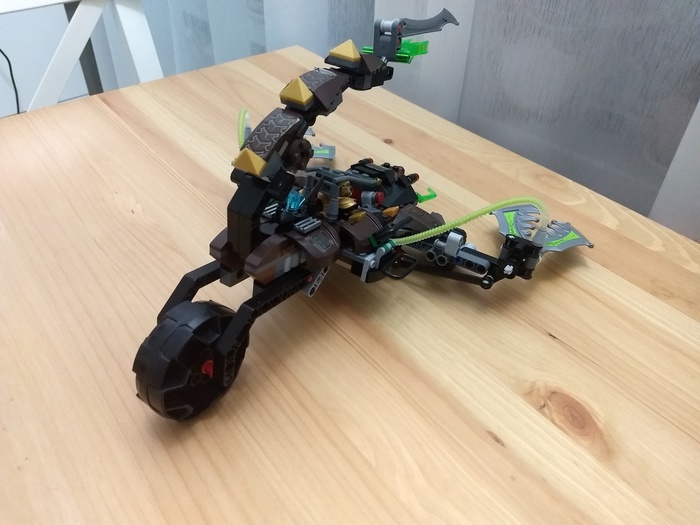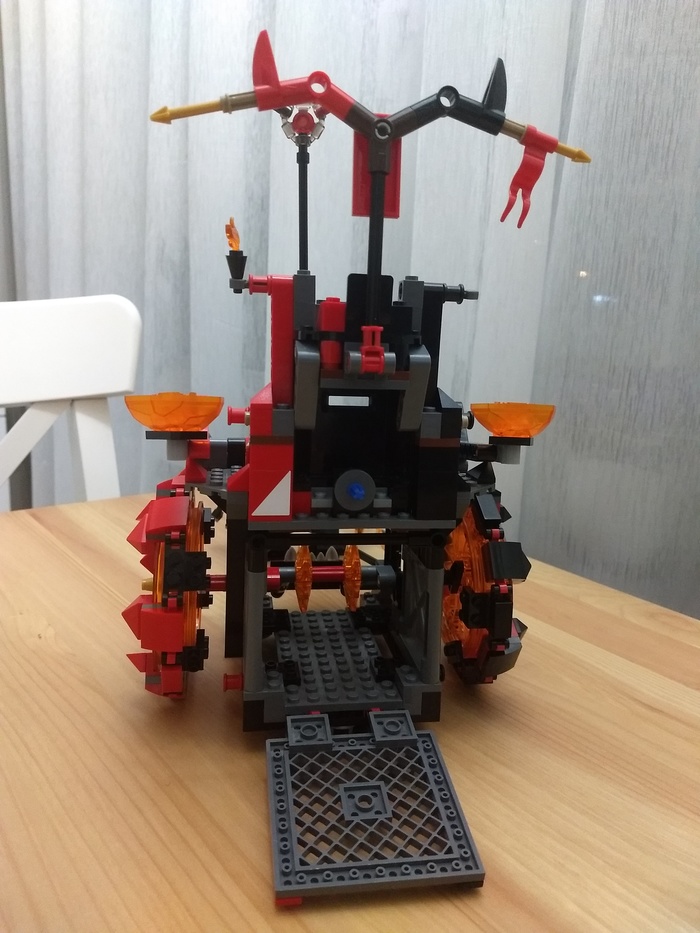 В наборе 650+ деталей. Конструкция весьма интересная, но набор, как мне показалось, не сильно располагает к творчеству. Много деталей украшений, мелких и соединительных деталей. Имхо, это хороший набор-дополнение, если нужна куча соединительных элементов классического лего. Сама телега весьма объёмная, есть большая тюрьма. Челюсти в передней части колесницы двигаются при движении, однако конструкция самих колёс и привода механизма челюсти такова что всё это дело работает только на ковре, на гладкой поверхности колёса скользят.