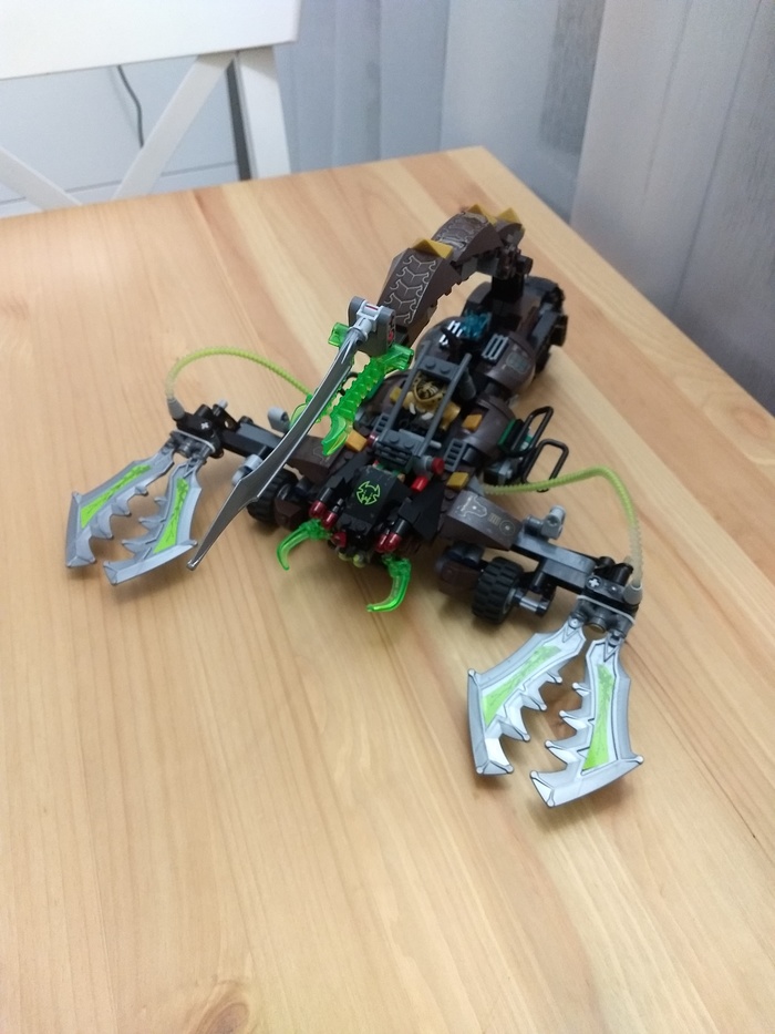 В наборе 400+ деталей. В отличии от двух предыдущих всего одна модель, но по сборке и конструкции она самая интересная. Скорпион умеет клацать клешнями, шевелить жалом и бодро кататься. В кончик жала вставляется шар и им можно стрелять. Я эти шары по глупости отсортировал то ли в мусор то ли в пакет с не оригиналом. Попробую найти, по памяти их мне встретилось штуки две или три из пяти.