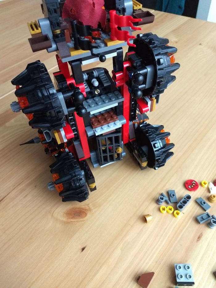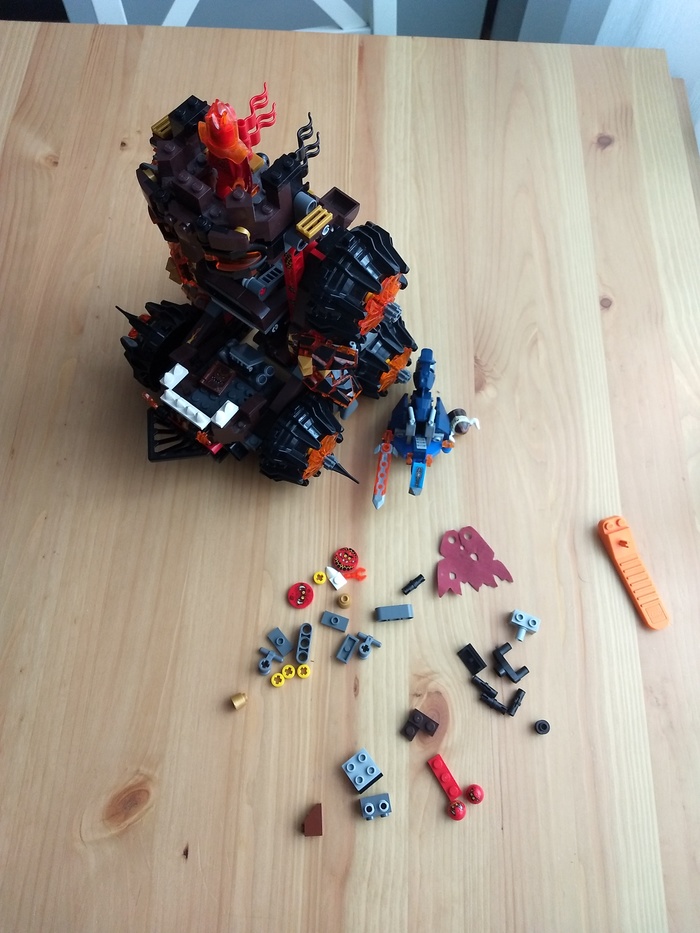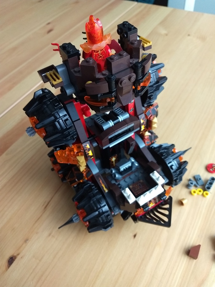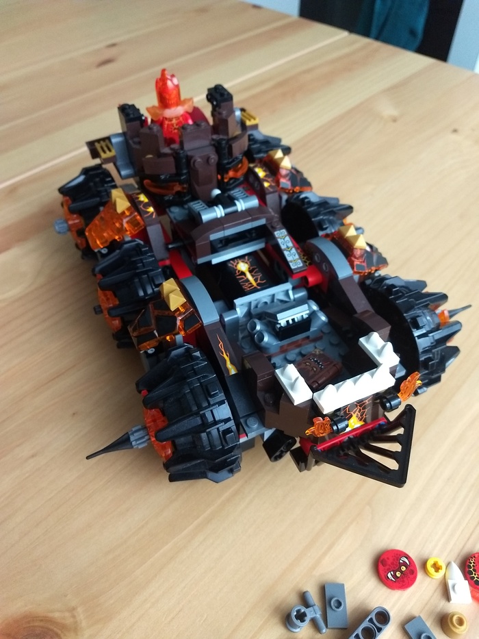 В течение недели собирал 70321 Роковое наступление генерала Магмара. Скажем так, это был первый набор, который я попробовал собрать, так сказать "с нуля". То есть в процессе разборки деталей были найдены некоторые элементы которые однозначно помогли идентифицировать набор. Из минифигурок нашёлся "огненный демон". В куче с человеко-частями были ещё какие-то рыцари, но я пока решил на них время не тратить. Комплектность всей колесницы не то чтобы огонь. Но так как конструкция достаточно крупная их недостаток не бросается в глаза. Стоит сказать что часть деталей не просто отсутствует, а просто я их не нашёл в куче, или думал, что нашёл ранее. То есть колёса все поголовно должны быть с шипами, и шипы эти есть, просто не нашёл так как подумал, что позже найду, но вот забыл. Серьёзной проблемой стало отсутствие детали 32278. Однако, это не повлияло на функционирование и внешний вид... э... машины?... И повлекло за собой отсутствие в дальнейшем проблем с ещё некоторыми отсутствующими деталями. Коняшка в комплекте оказалась тоже весьма интересной.