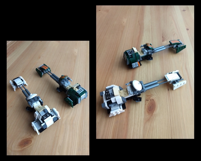 Следом собрал 75090 Скоростной спидер Эзры Бриджера. Ничего выдающегося из себя не представляет. Я вспоминаю набор по классической трилогии с похожими аэробайками. Так там в комплекте были прозрачные детали-подставки для имитации полёта, и тоже с летающими дройдами по скрытой угрозе. Тут этого нет, и это явный косяк. Не знаю, кто вообще его бы купил, ну то есть чисто промонабор по мотивам свежего блокбастера. Комплектность не огонь. не хватает части зелёных и белых деталей корпуса. Комплектность оценить можно где-то в 90 %, но это писсимистичный вариант.