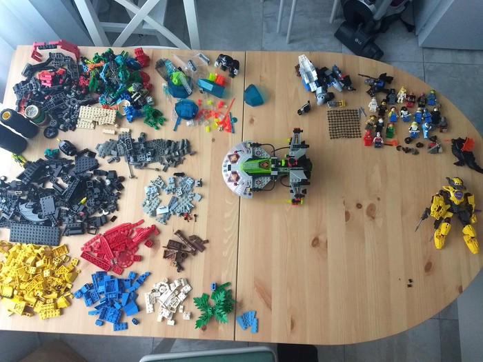 На последнем фото видно 4,5 кучки деталей жёлтых, чёрных, красных, синих и маленькая кучка белых. Ума не приложу от куда их могло столько взяться. Наверное, из сундучков MilkyWay. Но тогда не хватает много прозрачных деталей из этих же наборчиков.