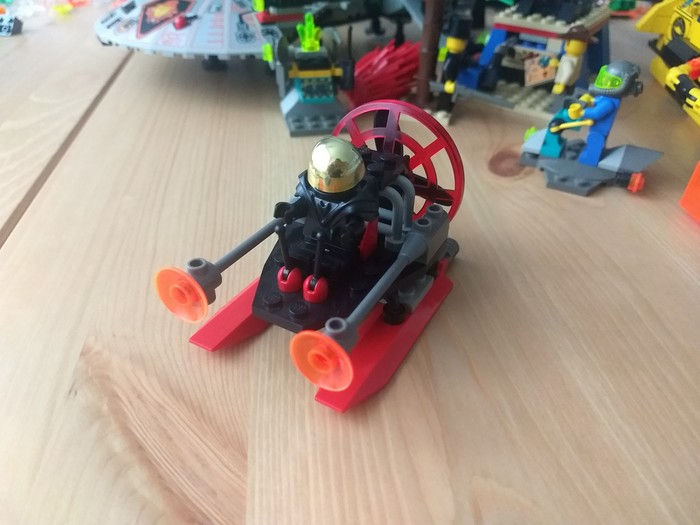 6915 Космический Корабль-Разведчик. Подарили в на день рождения в 1997 году. Мой самый любимый набор, так как самый большой по количеству деталей (234) и самый необычный. Правда самое горе что не хватает редкой детали - шлема пришельца. А остальное всякие мелочи. Если не знать, что там что-то должно быть - то никогда не догадаешься. Тут кстати имеет место первая сломанная деталь: резиновые шланги рассохлись и концевики стали плохо держаться на пинах, и это в первый год после покупки.