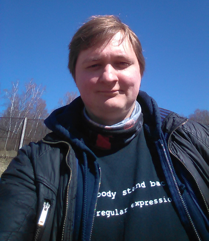 Технические характеристики: 33 года, 180 см, 84 кг. Не курю и негативно отношусь к тем, кто курит. Не парю и см. про курение. Не пью, но без фанатизма. Не матерюсь и, вообще, типа интеллигент. Играю в однопользовательские игры. Детей нет и в ближайшие годы не хочу, ни своих, ни чужих. INTJ, флегматик, трудоголик, умеренный социопат. Сова. Был хакером в исходном значении этого слова, но, похоже, выработался; однако, хакерские этика и культура мне по-прежнему близки. До перфекциониста не дотягиваю. Моё кредо: поступай с другими так, как хотел бы, чтобы они поступали с тобой ("золотое правило").