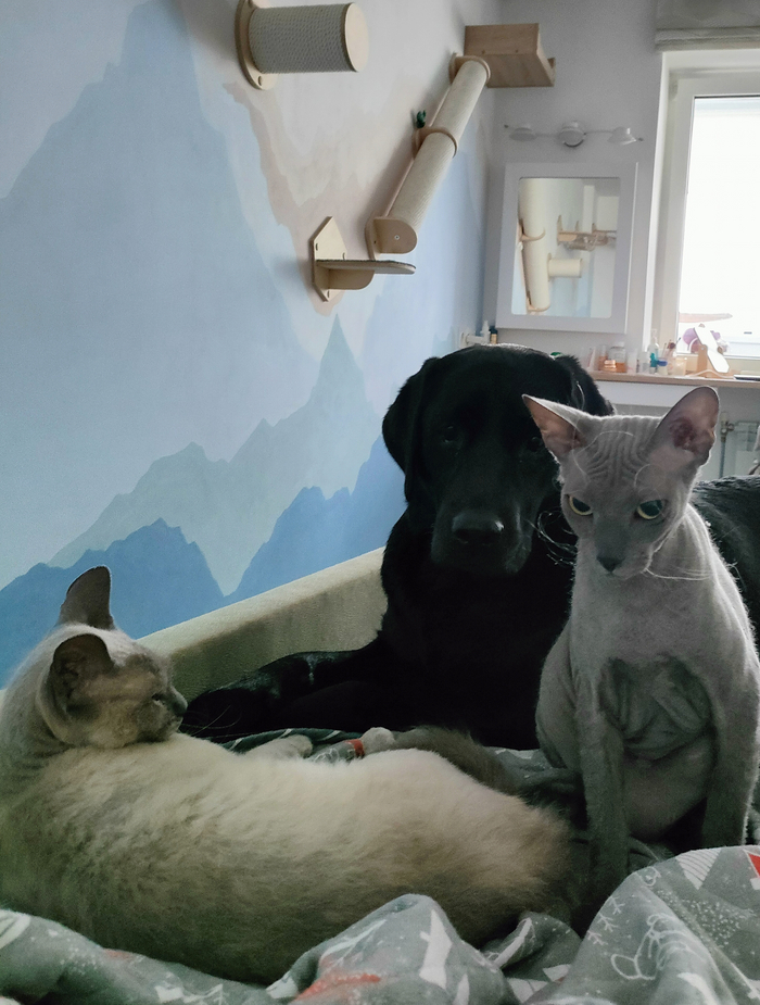 Замужем не была, детей нет и не планирую. Есть три замечательных хвоста: собака, кошка, кот. Животных я люблю, а своих просто обожаю!