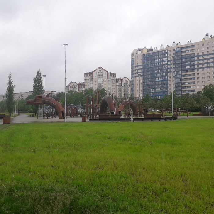 С утра в СПб был сильный ливень, который к полудню перешёл в моросящий дождь, поэтому прогулка прошла по всему парку (а не до моста, как в предыдущий раз).