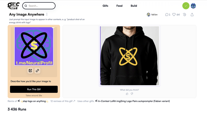 Сайт - просто красота, загружаете лого с компа в размере 1:1, прокручиваете немного вниз, где нужно написать промпт, собственно, пишете запрос, какую вещь или окружение нужно сгенерировать, например product shoot of an Energy drink, нажимаете Run This Glif и секунд через 10-15 получаете изображение продукта с вашим лого. Можно скачать в jpg