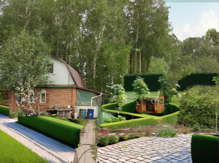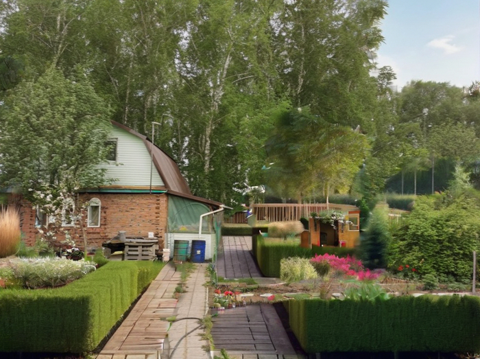 Возникла необходимость обновить внешний вид загородного "огорода". Да, благодаря стараниям и дикому трудолюбию тёщи дача стала просто огородом... Но после выхода на пенсию я понял что просто не потяну это разнообразие овощей. Надо что-то менять... Дизайнер из меня ещё тот и было принято волевое решение привлечь ИИ. Для пробы беру Easy Diffusion v3.0.9, установленный на компьютер и использую различные модели на эталонную картинку. В самом начале изображение участка с видом на дом. Первая картинка эталон, а дальше что сделал ИИ...