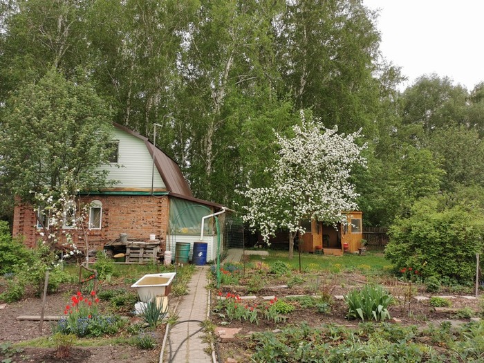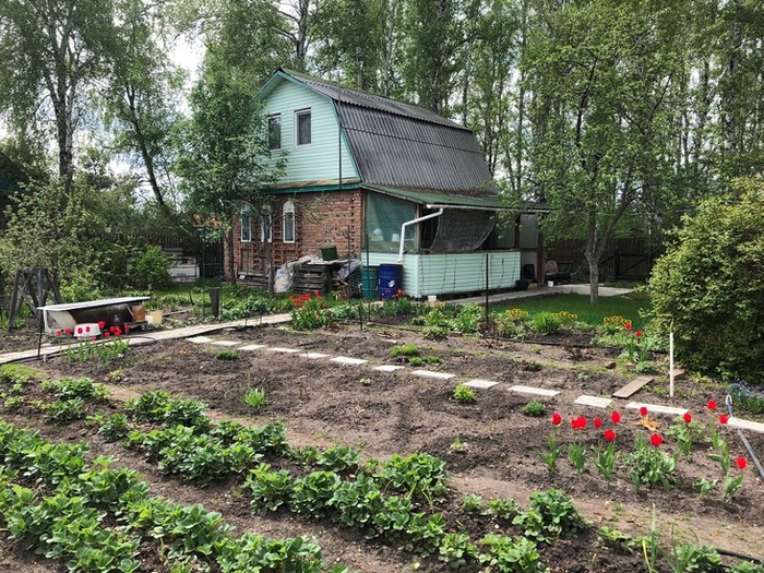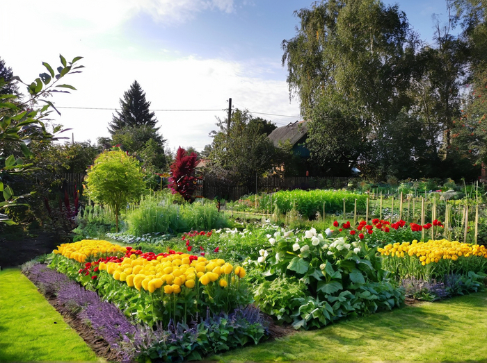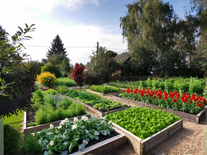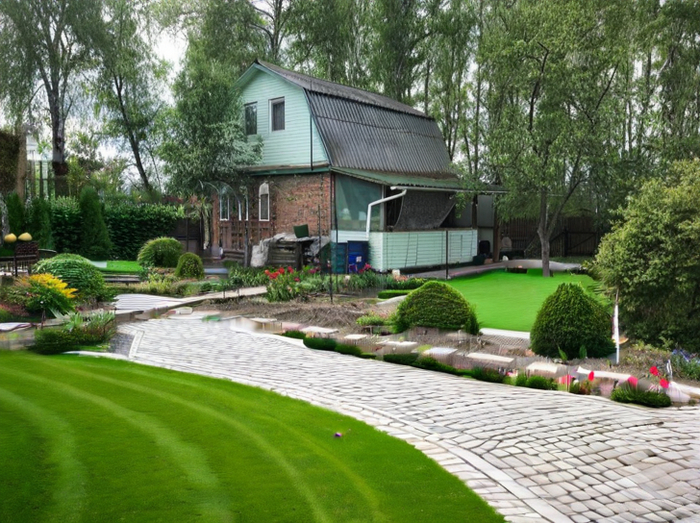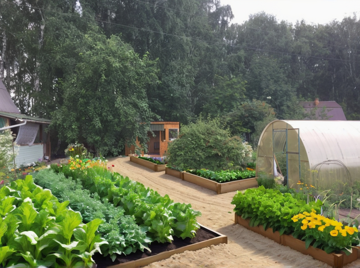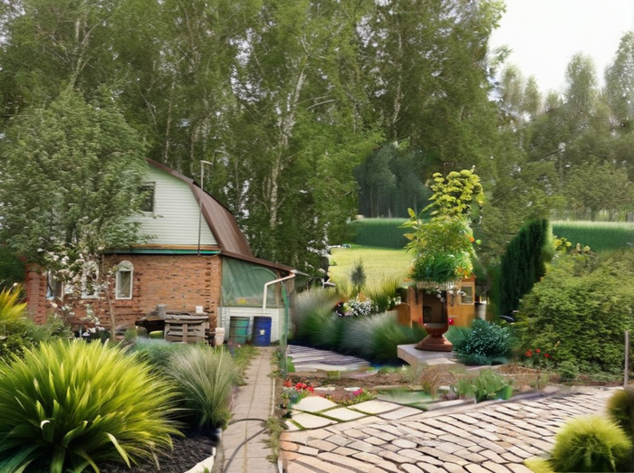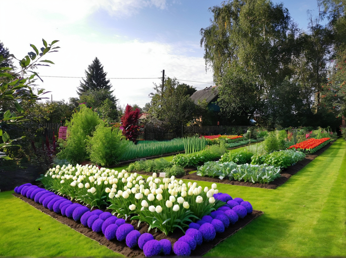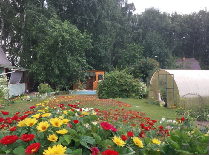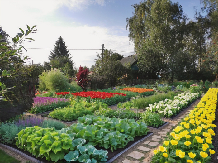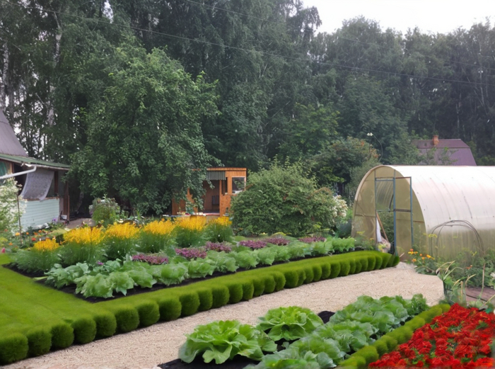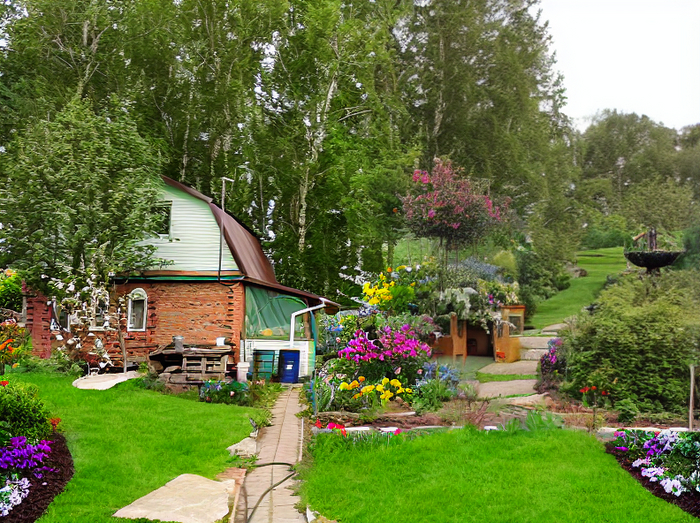Prompt который я использовал во всех случаях: Landscape design of a country plot in a classic style, vegetable beds, lots of flowers, realistic photo